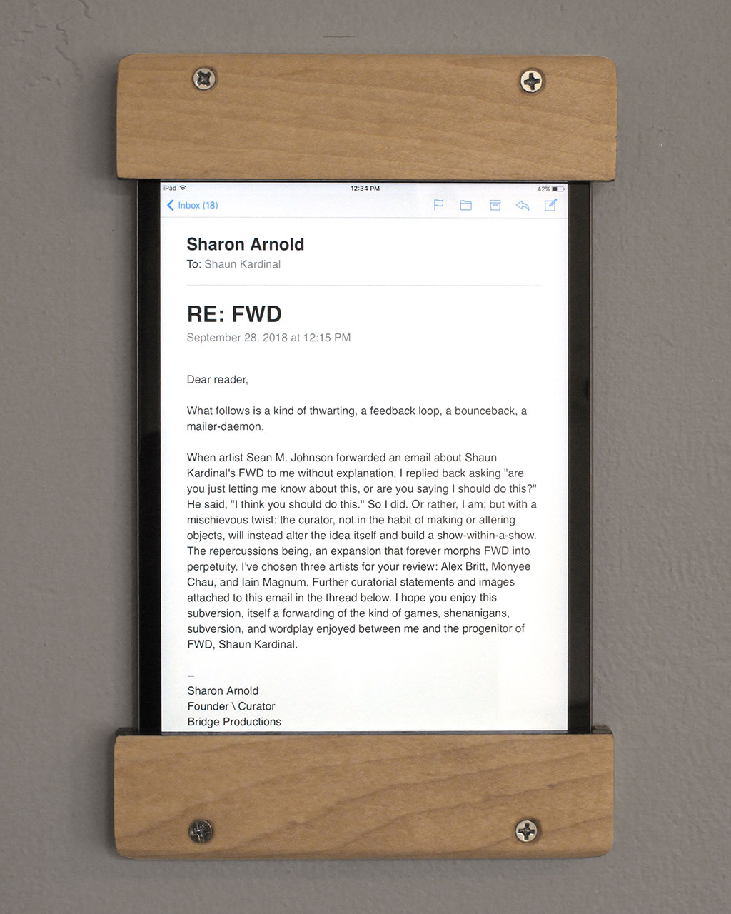 Forward is in motion. The work presented in each exhibition is impermanent, made to be passed on to a new artist. While in their possession, they are charged with transforming it. They may alter, activate, destroy, refine or redefine the piece in any way, so long as they retain some physical, aesthetic or abstract connection to what they’ve received.